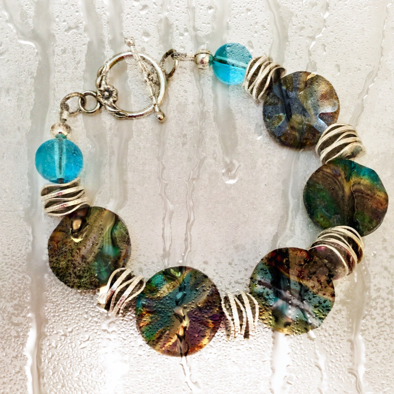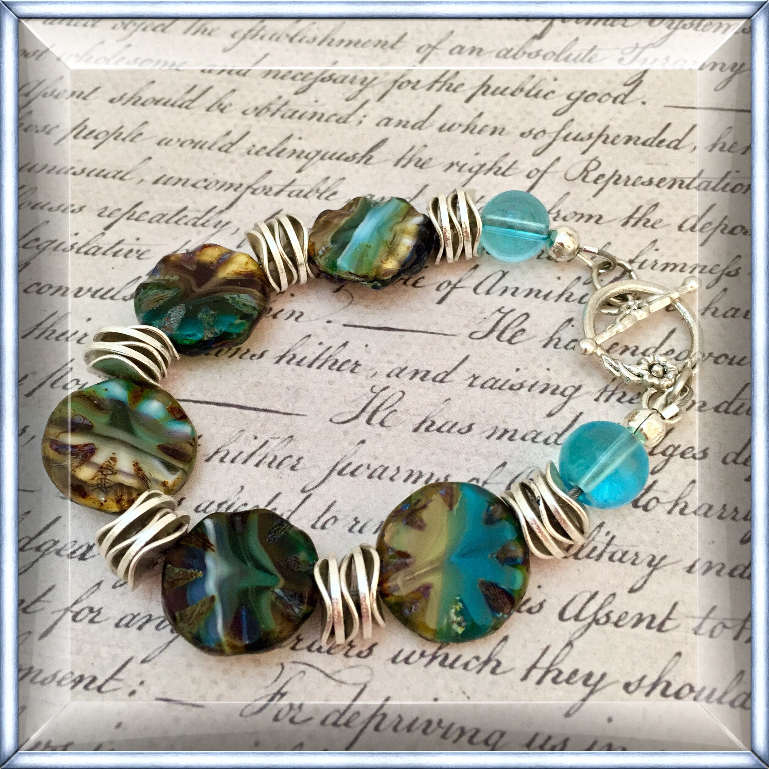 Czech glass coin beads in a sand and Aqua color, Sandy Beach, with a Picasso finish combined with silver tone disks. 2 are available, one with a toggle clasp, the other with a lobster clasp. Please contact me as to which you would like. 7″ long. $15.00 to purchase.