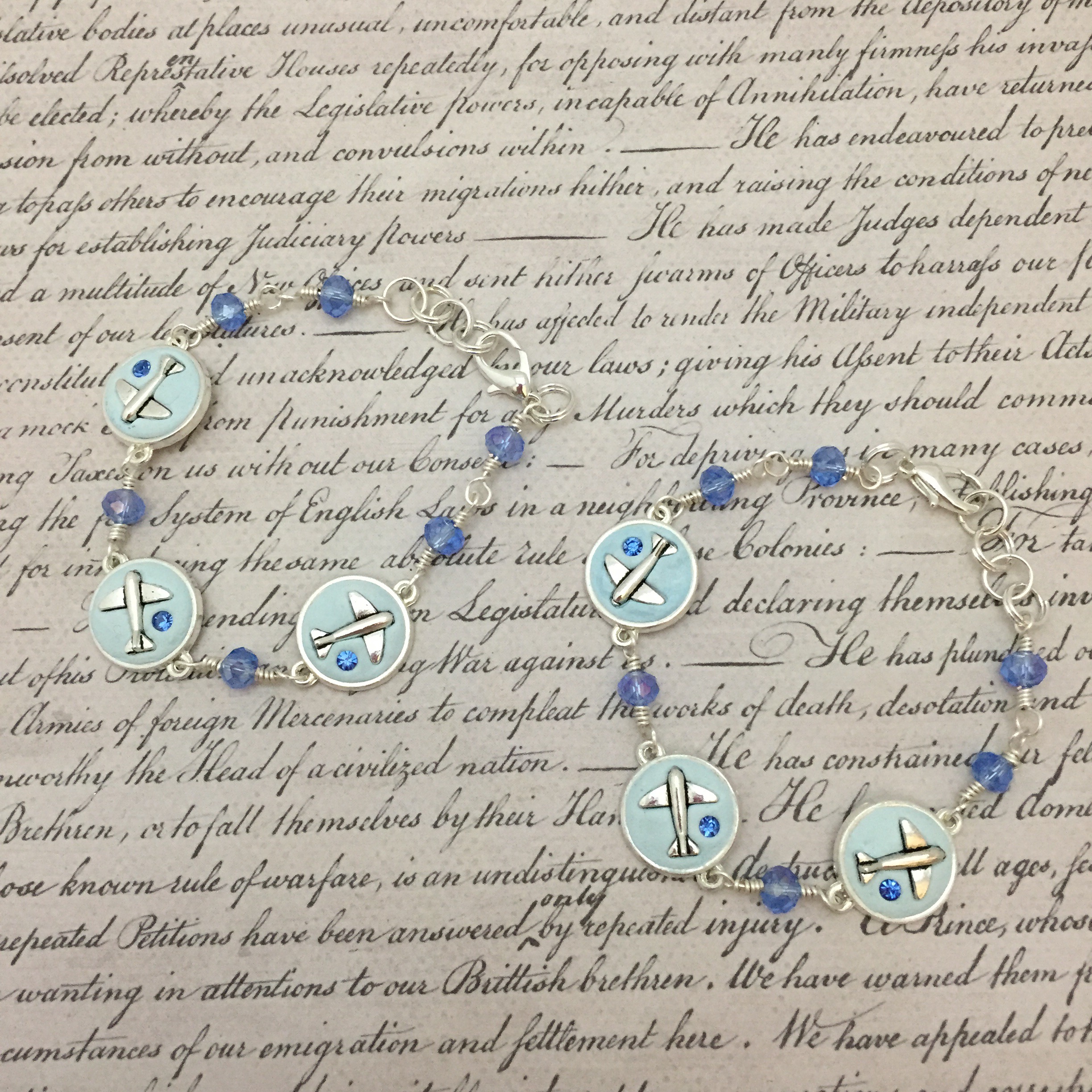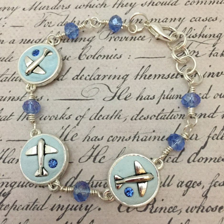Handmade bracelets with 3 charms, each containing a small embedded airplane and a blue crystal. The rest of the bracelet is made with blue crystals, securely hand wrapped with tarnish-resistant wire and a lobster clasp. The blue crystals may appear lighter in the pictures than real life. Each runs about 7″ to 7 1/4″ long. Several are available at $10 each. Contact me to purchase.