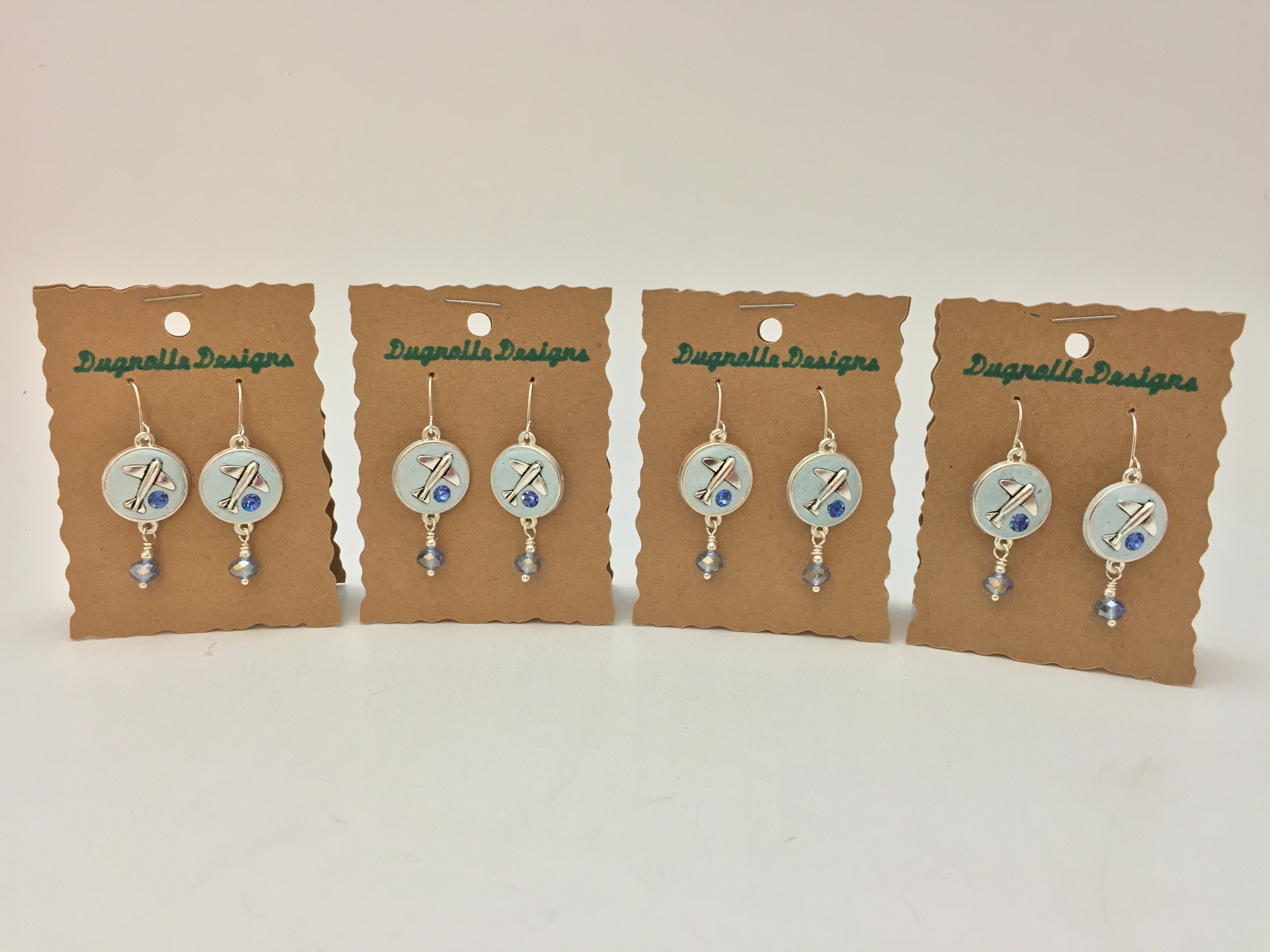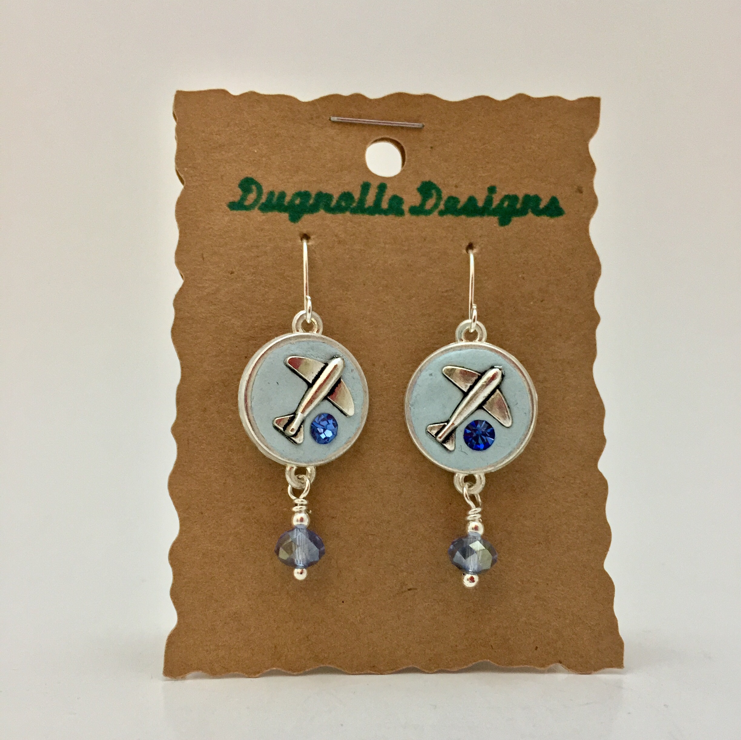 Ear wires each with a single charm and crystal dangle. A small airplane and a single blue crystal are imbedded into a field of pale blue epoxy. A small blue crystal dangles beneath. The blue crystals may appear a bit lighter in the pictures than they are in real life. Great for the flight attendant, pilot, or a pilot’s wife/girlfriend. $8 pair. Contact me to purchase. Several pairs available