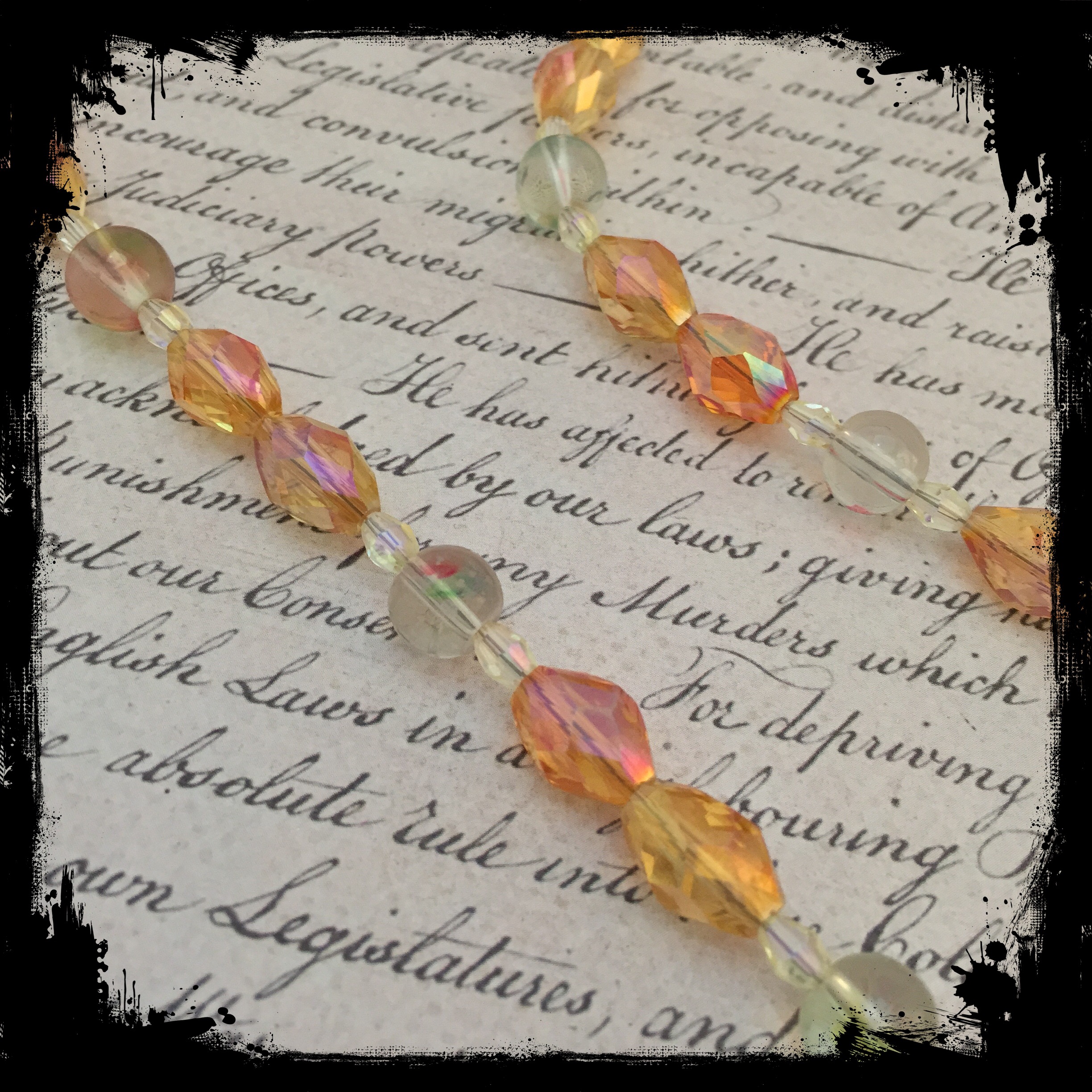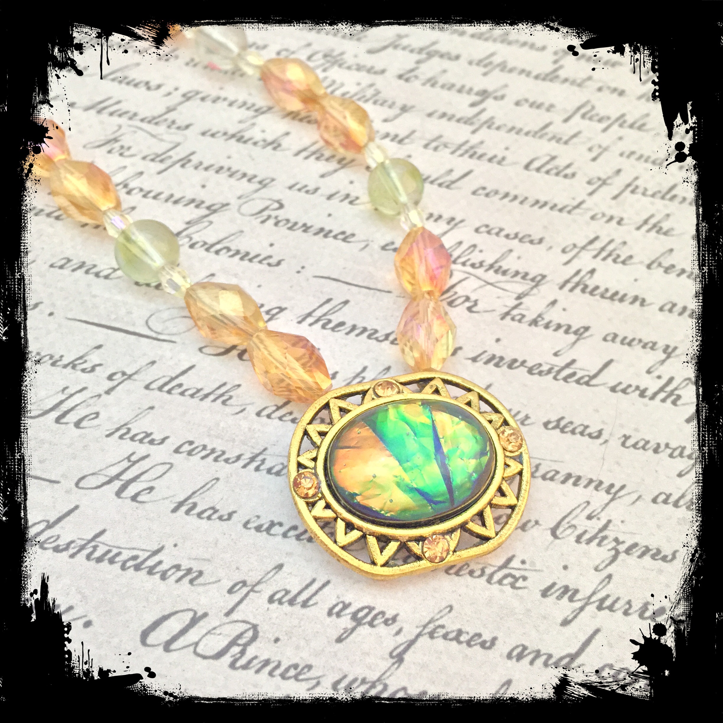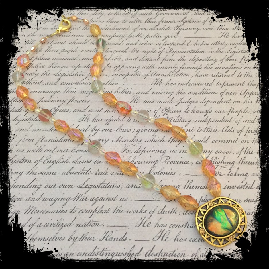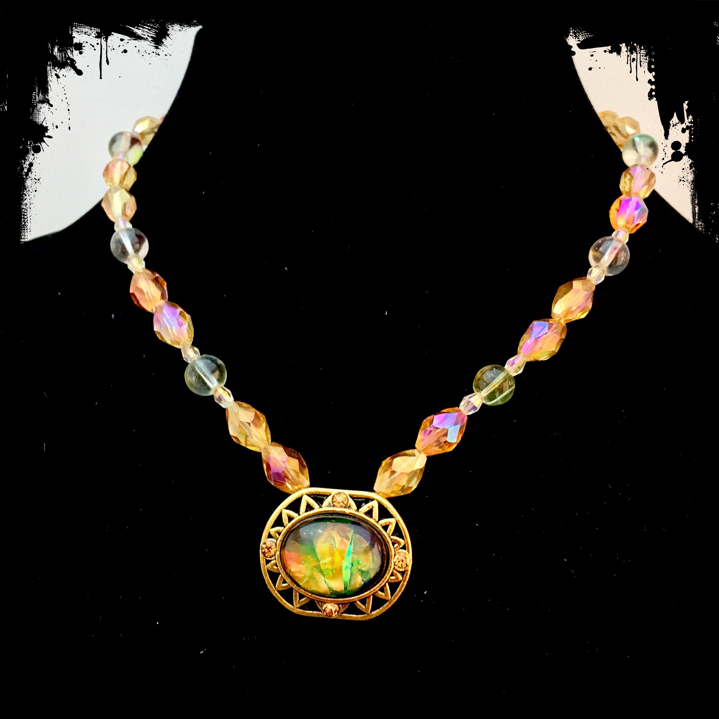 Necklace, Green fire necklace Date: August 17, 2015Author: tddugnolle Category: Necklaces Tags: gold necklace, green necklace, orange necklace Post navigation ← Airplane earrings Golden fire necklace → Golden focal piece with crystals and a center of fiery green and orange, on a single strand of crystal and glass beads in orange and subtle greens. 18″ long with a lobster clasp. $12. Contact me to purchase. Share this: Click to email a link to a friend (Opens in new window) Email Like Loading... Related